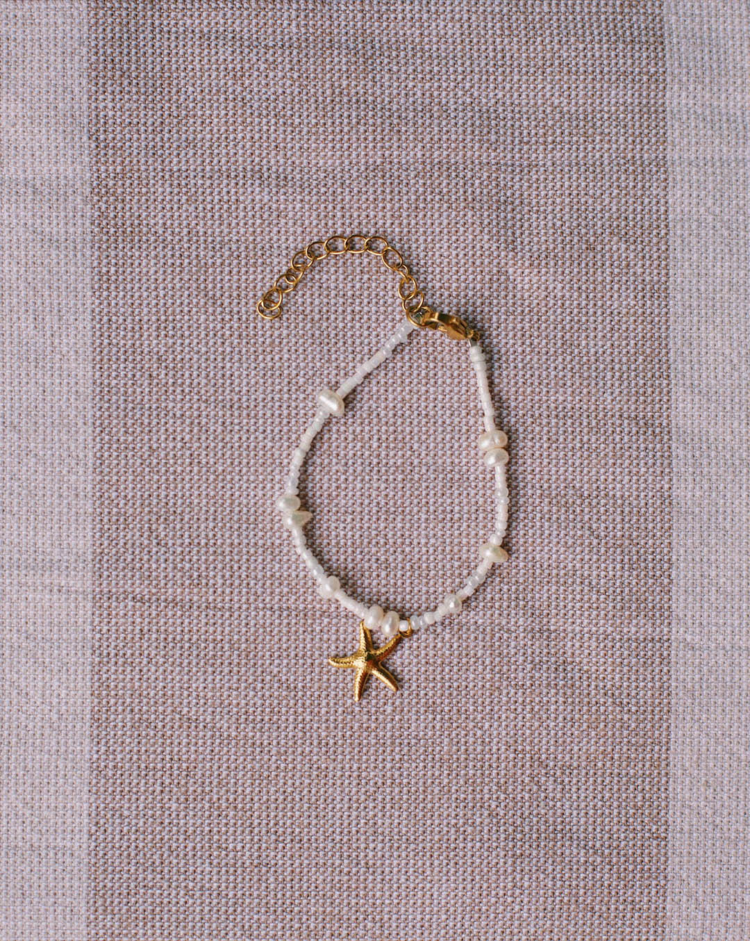 Narukvica od bijelih perlica s riječnim biserima i zvijezdom od nehrđajućeg čelika.